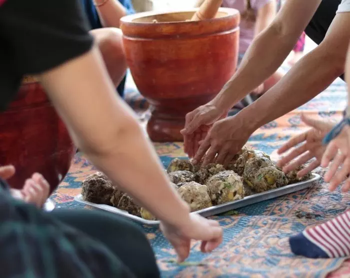 ChangChill heeft ook een eigen moestuin en u krijgt te horen welke planten, bladeren, wortels en kruiden worden gebruikt als medicijn voor o.a. olifanten. Veel van dit plantaardig materiaal bevat ook waardevolle voedingsstoffen. Hoewel olifanten ongeveer 120 verschillende plantensoorten eten, nemen ze maar 40% voedingsstoffen op en daarom hebben ze voedingsupplementen nodig. Daarom wordt u vervolgens betrokken bij het maken van snacks voor de olifanten met ingrediënten uit o.a. de kruidentuin.