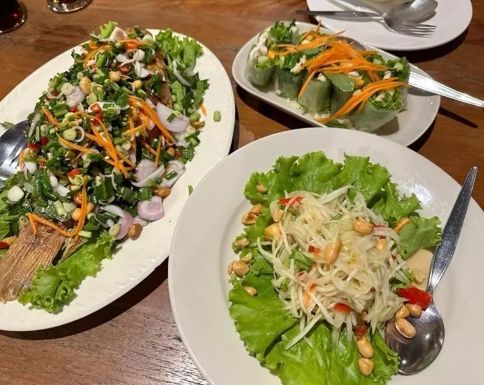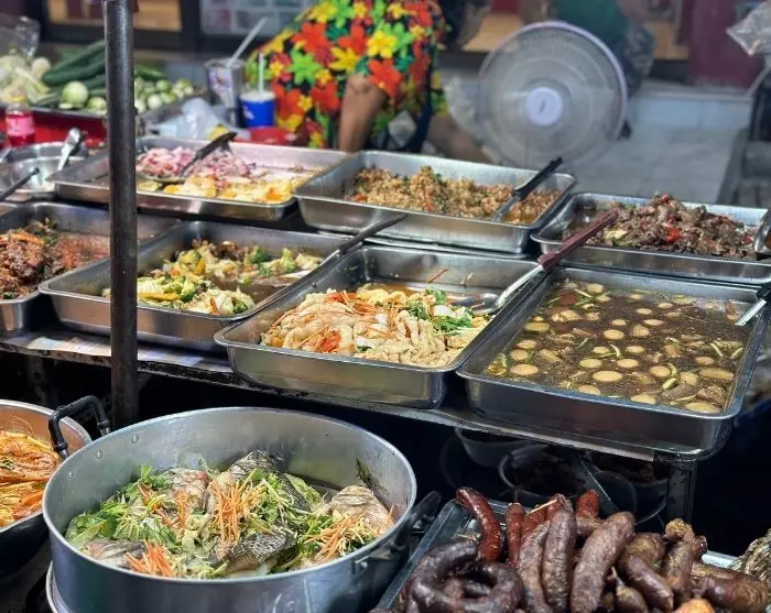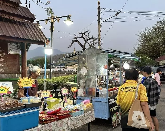 Elke avond verandert Walking Street in een levendige nachtmarkt, waar je alle eetkraampjes kunt verkennen en je kunt laten verleiden door de lokale keuken. De avondmaaltijd wordt genoten op een deken aan een lage tafel, net als de lokale bevolking. Hier kun je ook de Wat Chong Kham-tempel bewonderen, die wordt weerspiegeld in het gelijknamige meer erachter.
