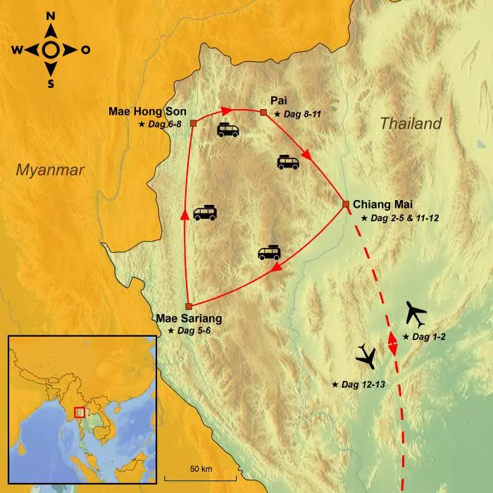 Het avontuur begint in Chiang Mai, een charmante stad die rijk is aan cultuur en geschiedenis en die prachtig gelegen is in een vallei omringd door majestueuze bergen. Vanaf hier ga je op weg over de beroemde Mae Hong Son Loop, een spectaculaire route van meer dan 600 km die met 1.864 haarspeldbochten door fascinerende landschappen slingert.