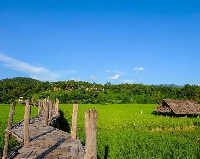 De reis gaat verder naar de iconische Sutongpe-brug. De indrukwekkende bamboebrug strekt zich uit over weelderige rijstvelden en verbindt een dorp met de boeddhistische tempel Wat Phu Sama. De Sutongpe-brug is een van de langste bamboebruggen van Thailand, ongeveer 500 meter lang. Hij werd gebouwd door lokale dorpelingen en monniken als symbool van samenwerking en geloof. De brug speelt nog steeds een rol in hun dagelijks leven, omdat de monniken hem dagelijks oversteken op hun aalmoezenrondes.
