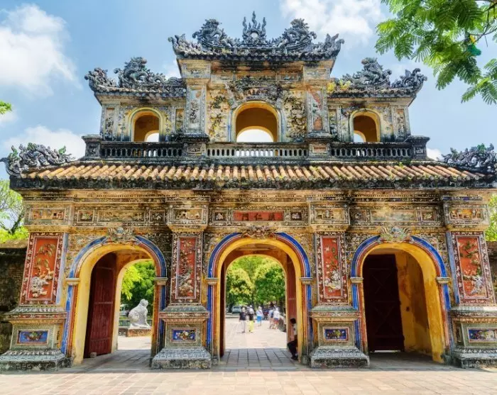 De reis gaat vervolgens verder naar het afgelegen An Dinh paleis. Gebouwd aan het begin van de 20e eeuw als residentie voor de keizerlijke familie, combineert het paleis Vietnamese keizerlijke architectuur met elegante Europese elementen. Binnen kunt u indrukwekkende muurschilderingen, gouden ornamenten en weelderige details bewonderen, terwijl de omliggende tuinen rust en grandeur uitstralen.