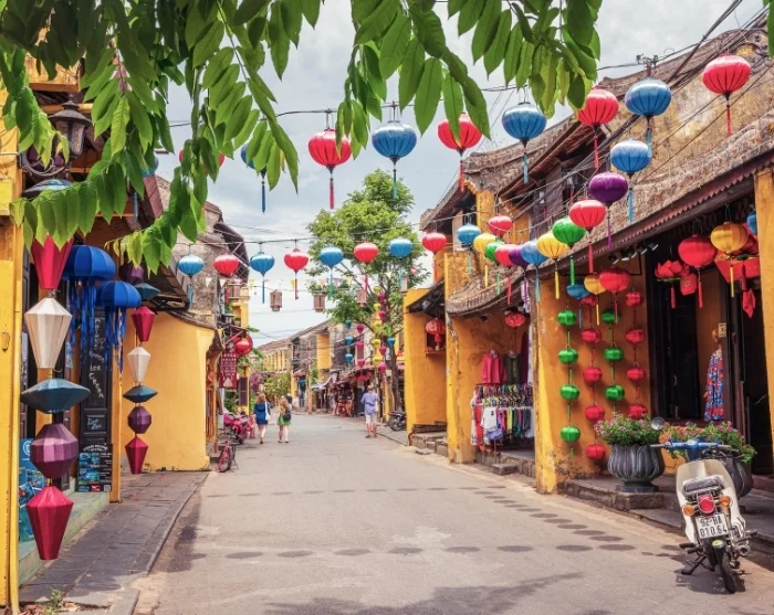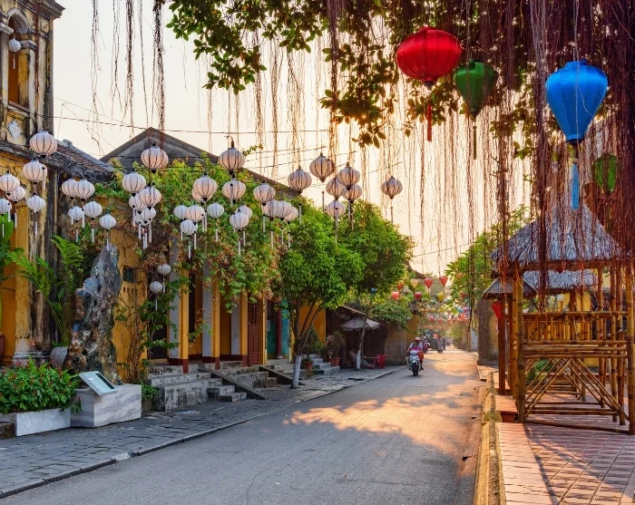 Wie van de rivier afloopt, ontdekt een doolhof van sfeervolle straatjes. U vindt hier een levendige mix van Japanse houten huizen, Chinese vergaderzalen, elegante Franse koloniale panden en karakteristieke koophuizen. Boven uw hoofd hangen slingers met kleurrijke lantaarns, wat vooral bij het invallen van de avond een magische sfeer oproept. Winkeltjes, streetfoodkraampjes, cafés en gezellige restaurants nodigen u uit om op uw gemak rond te dwalen en te genieten.