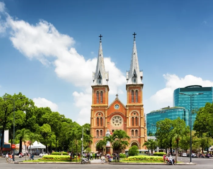 Recht tegenover het postkantoor vindt u de iconische Notre Dame-kathedraal, gebouwd tussen 1863 en 1880. De kathedraal valt op door het rode metselwerk en de hoge torens, een indrukwekkende erfenis uit de Franse koloniale periode.