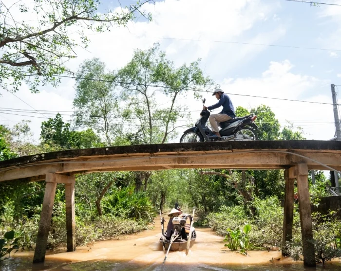 Wanneer u Ho Chi Minhstad achter zich laat, merkt u direct dat het landschap verandert. Onderweg ziet u uitgestrekte groene velden en rijdt u over een lappendeken van kleine riviertjes en kronkelende kanalen die zich door het vlakke landschap banen. Het is heel normaal om lokale boeren aan het werk te zien op hun akkers, net als waterbuffels die langs de weg grazen en kraampjes aan de kant van de weg waar vers fruit wordt verkocht.