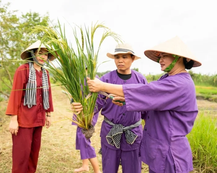 Daarna bezoekt u ons sociale duurzaamheidsproject in Vinh Long, opgezet door onze lokale partner. U maakt een ontspannen wandeling door het dorp, waarbij uw gids onderweg uitgebreid vertelt over het initiatief. U krijgt bovendien de gelegenheid om het traditionele plattelandsleven van dichtbij mee te maken. Samen met lokale boeren mag u de handen uit de mouwen steken: afhankelijk van het seizoen helpt u met het planten van jonge rijstplantjes of met de oogst. Het is een boeiende, eerlijke belevenis, die u een uniek inkijkje geeft in het dagelijks leven op het Vietnamese platteland en het werk achter duurzame landbouw. Door deel te nemen aan deze reis steunt u bovendien de families in Vinh Long, want een deel van de reissom gaat direct naar het project. Hier leest u er meer over.