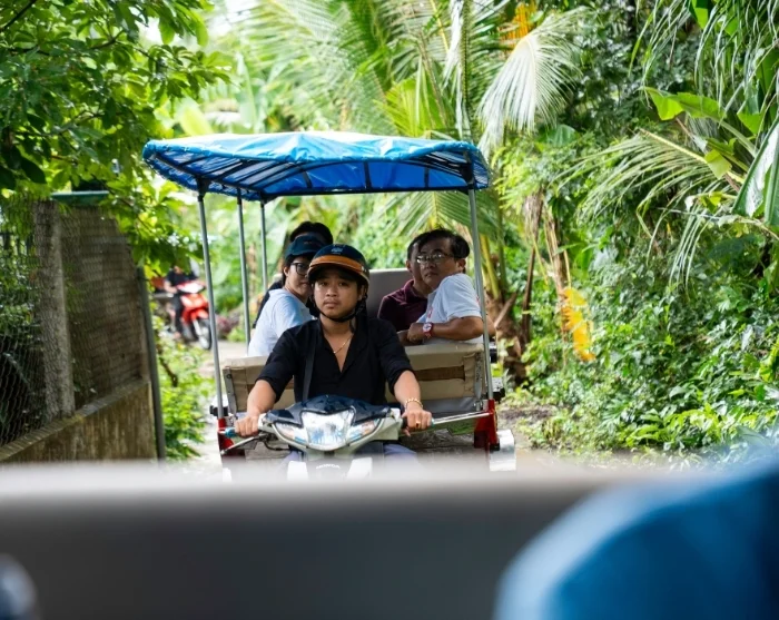Uw avontuur gaat verder met een boottocht naar een rustig eiland midden in de Mekongrivier. Hier geniet u van een Vietnamese lunch, bereid met verse, lokale ingrediënten—omringd door weelderig groen en het rustgevende ritme van het leven aan de rivier.