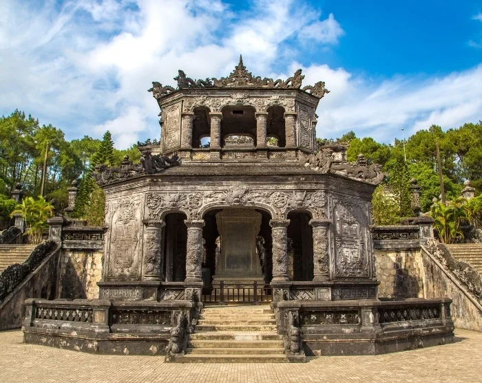 De reis vervolgt naar het mausoleum van keizer Khai Dinh, dat zich duidelijk onderscheidt van de andere keizerlijke graven in de omgeving. Deze tombe, gebouwd aan het begin van de 20e eeuw, is een unieke combinatie van Vietnamese traditie en Europese barokke en gotische invloeden. Het resultaat is een bijzonder en rijkelijk versierd bouwwerk dat zowel een eerbetoon is aan de overleden keizer, als een weerspiegeling van zijn fascinatie voor westerse kunst en cultuur.