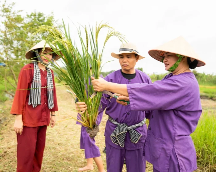 Daarna brengt uw reis u naar ons sociaal duurzaamheidsproject in Vinh Long, opgezet door onze lokale partner. U maakt een ontspannen wandeling door het dorp, waarbij uw gids onderweg meer vertelt over het project. U krijgt bovendien de kans om het traditionele plattelandsleven van dichtbij te ervaren. Samen met lokale boeren gaat u aan de slag op de rijstvelden afhankelijk van het seizoen helpt u mee met het planten van jonge stekjes of juist met de oogst. Deze praktische en verrijkende activiteit biedt een uniek inkijkje in het dagelijkse leven op het Vietnamese platteland én in de toewijding waarmee duurzame landbouw wordt bedreven. Uw deelname aan deze reis ondersteunt bovendien families in Vinh Long, want een deel van de reissom gaat direct naar het project. Meer informatie hierover vindt u hier.
