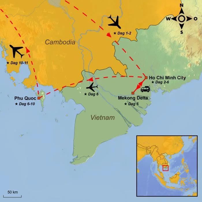 Ervaar de veelzijdigheid van Zuid-Vietnam: van de bruisende energie van Ho Chi Minhstad tot ontspannen boottochten over de Mekongdelta, inclusief een bezoek aan ons sociale duurzaamheidsproject in Vinh Long. Sluit uw avontuur af met een heerlijke strandvakantie op het eiland Phu Quoc.