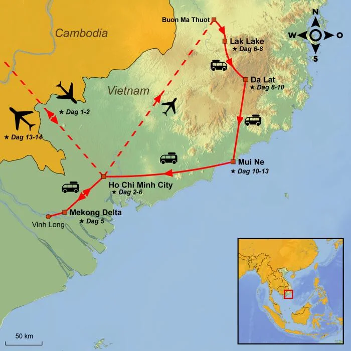 Ontdek de charme van de Mekongdelta, de serene schoonheid van het Lak Meer en de betoverende, koele hooglanden van Da Lat – allemaal omlijst door het bruisende stadsleven in Ho Chi Minhstad en de met palmen omzoomde stranden van Mui Ne.