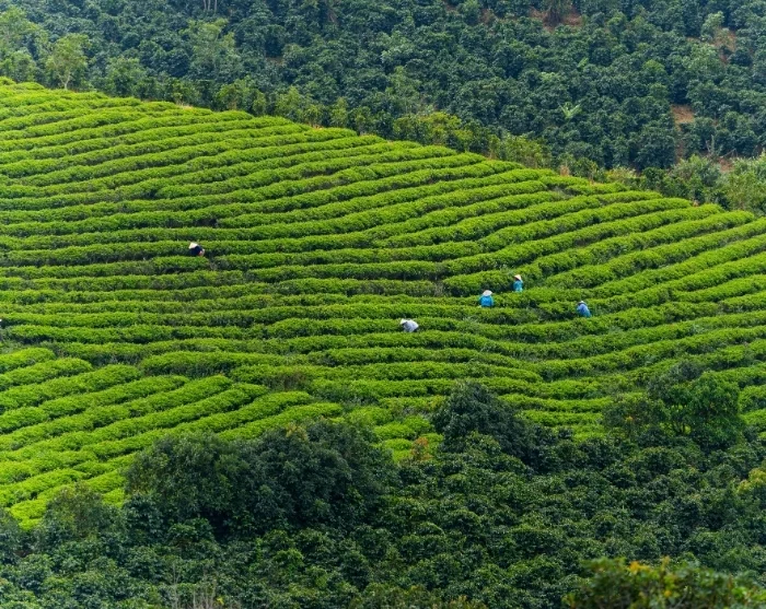 Uw dag begint met een treinreis naar Trai Mat, waarbij u onderweg een prachtig uitzicht heeft over de glooiende heuvels rondom Da Lat. Na aankomst in Trai Mat verkent u het omliggende platteland, voordat u verdergaat naar de Cau Dat-theeplantage. Hier lijken de weelderig groene theestruiken zich eindeloos uit te strekken. U ontdekt alles over de productie van thee en kunt genieten van een vers gezet kopje terwijl u uitkijkt over het indrukwekkende hooglandlandschap.