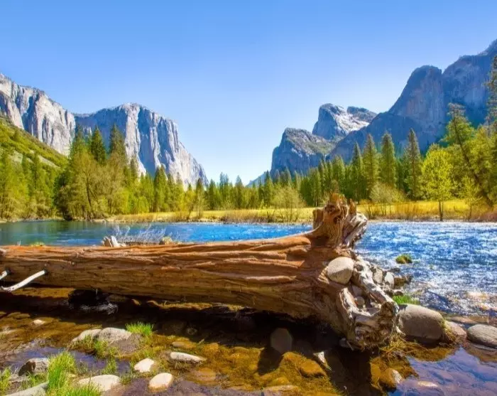 De door gletsjers bergen rijzen al op in de verte, terwijl de ijskoude bruisende Merced River zich prachtig door de Yosemite-vallei snijdt.