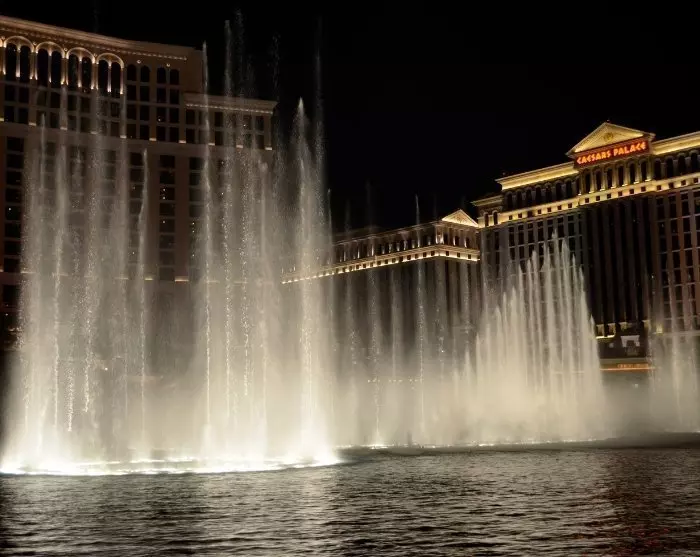 Bij aankomst in je themahotel is het moeilijk om niet te glimlachen bij het zien van de vele knipperende machines, waar tientallen hoopvolle spelers aan de ‘arm’ zitten te trekken. Check in bij het hotel, neem een duik in het zwembad en geniet van een avond in een van de vele restaurants in de stad. Deze avond kun je al stoppen bij de beroemde fontein voor hotel Bellagio, die sinds de opening in 1998 voor voorbijgangers indrukwekkende watershows verzorgt op de klanken van klassieke muziek.