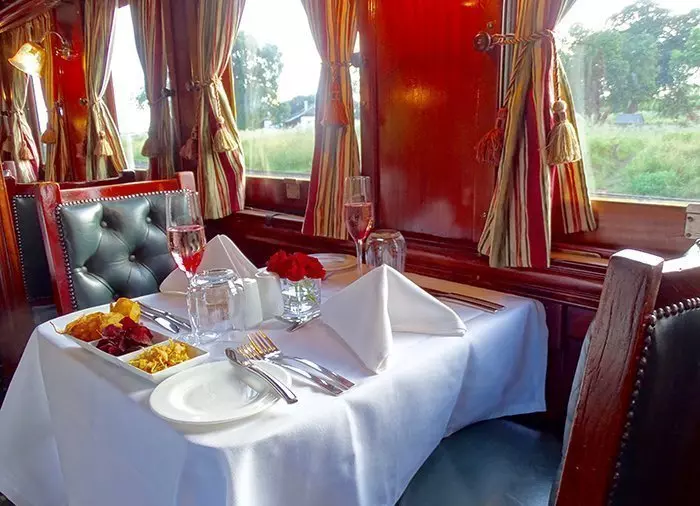 Na de stop op de brug gaat de trein richting Zambia of Zimbabwe. Het is nu de hoogste tijd om het stijlvolle restauratierijtuig te vinden. Hier wordt een vijfgangenmenu met bijbehorende wijnen geserveerd.