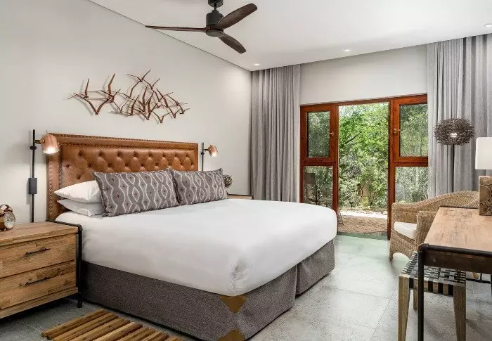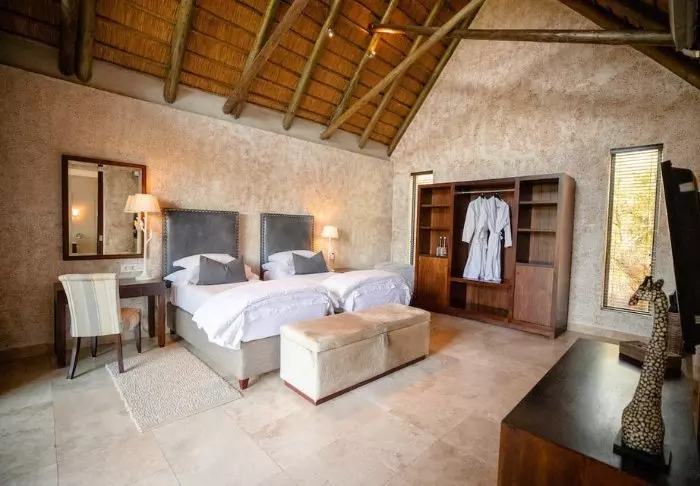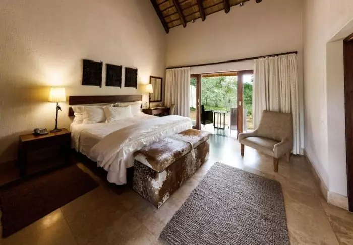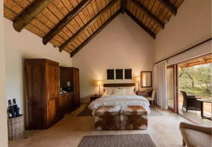 Er staan hier slechts vijftien suites en tien villa’s die allemaal luxueus en stijlvol in gedempte, natuurlijke kleuren zijn ingericht. De inrichting neemt daardoor niet de aandacht weg van de natuur die zich net buiten de grote ramen bevindt. Alle suites hebben een eigen terras, waar u kunt genieten van het uitzicht op de bush. Uiteraard is er ook airconditioning, een minibar en koffie- en theefaciliteiten.