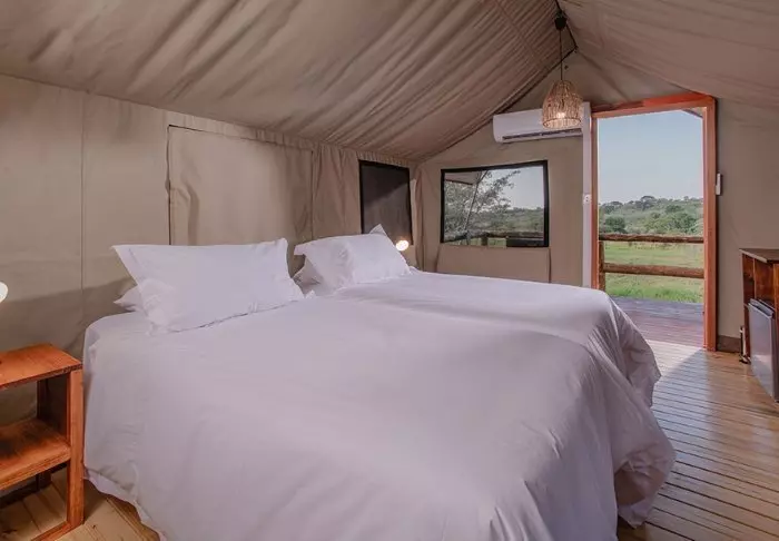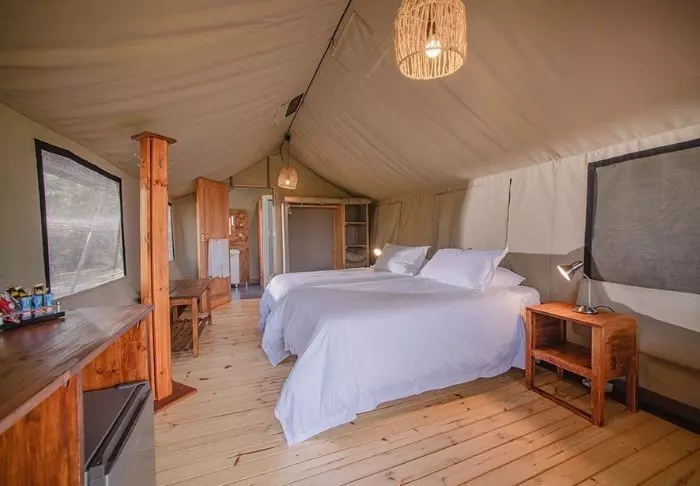 Hier verblijft u in mooie, ruime canvastenten die op platformen boven de grond staan. De tenten zijn voorzien van moderne gemakken, zoals een houten vloer, elektriciteit, airconditioning, goede toilet- en badkamerfaciliteiten en apparaten om thee of koffie te zetten. Dankzij de wanden van canvas kunt u nog steeds de natuur net buiten de tent horen en ruiken! Er zijn tenten met een tweepersoonsbed en tenten die speciaal zijn ingericht voor gezinnen. Alle tenten hebben een eigen veranda.